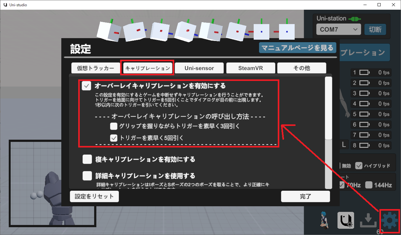また、Uni-studio内の設定(歯車マーク)からキャリブレーションタブ、”オーバーレイキャリブレーションを有効にする”にチェックを入れると、SteamVRにいる状態でコントローラーを地面に向けトリガーを5回引くことで上でやったキャリブレーションを実行することができます。