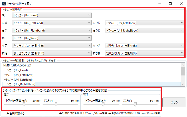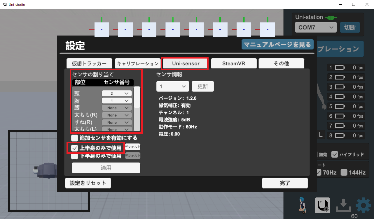 次に”Uni-sensor”タブを開き、”上半身のみで使用”にチェックを入れ、センサの割り当てをします