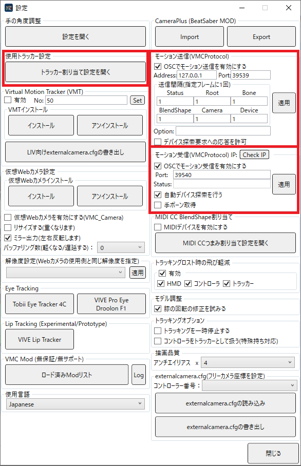 “OSC/VMCプロトコルで受信する”にチェックを入れ、ここに記載されているLAN IPとポート番号をVMC側の詳細設定”モーション送信”に入れましょう。