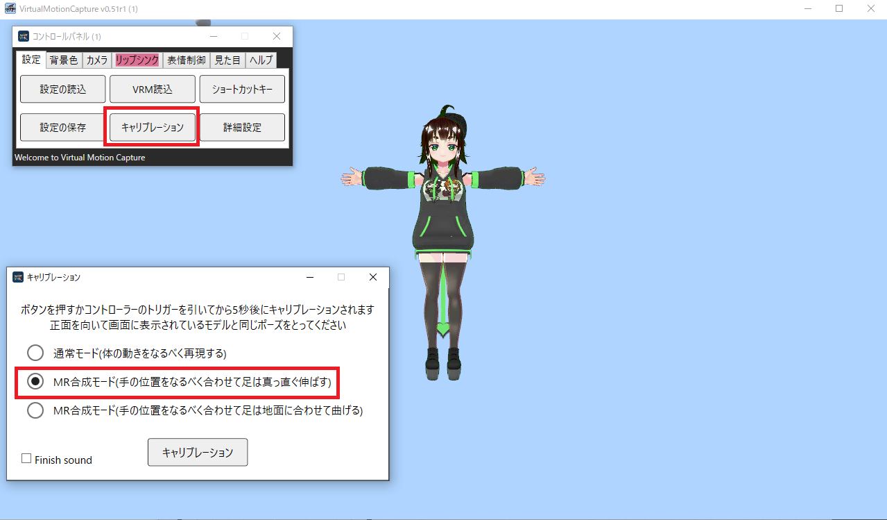 コントロールパネルからキャリブレーションを選択し”MR合成モード(手の位置をなるべく合わせて足は真っ直ぐ延ばす)”にチェックを入れキャリブレーションを開始しましょう。