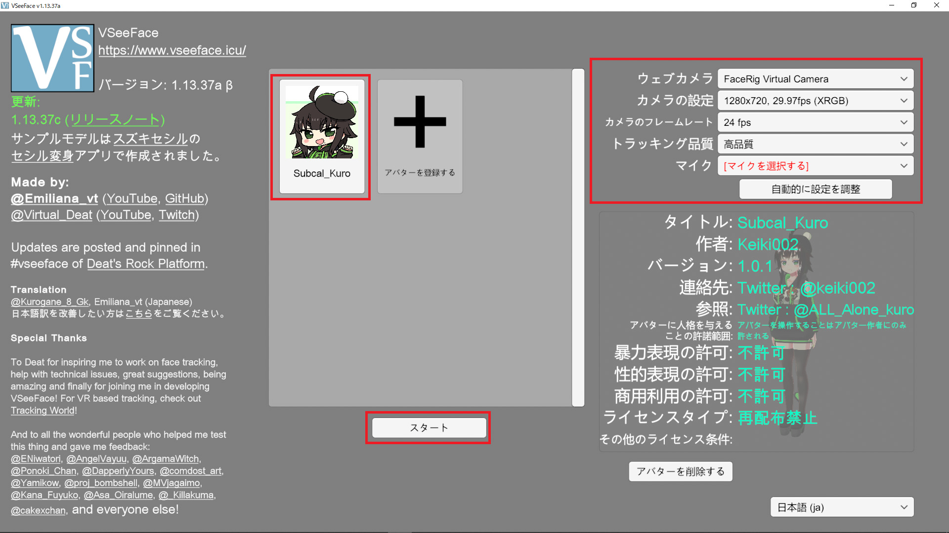 初めの画面でVRMとカメラなどの設定があるので表示させたいVRMを読み込ませ、適当なWEBカメラなどを選択しておきましょう。
