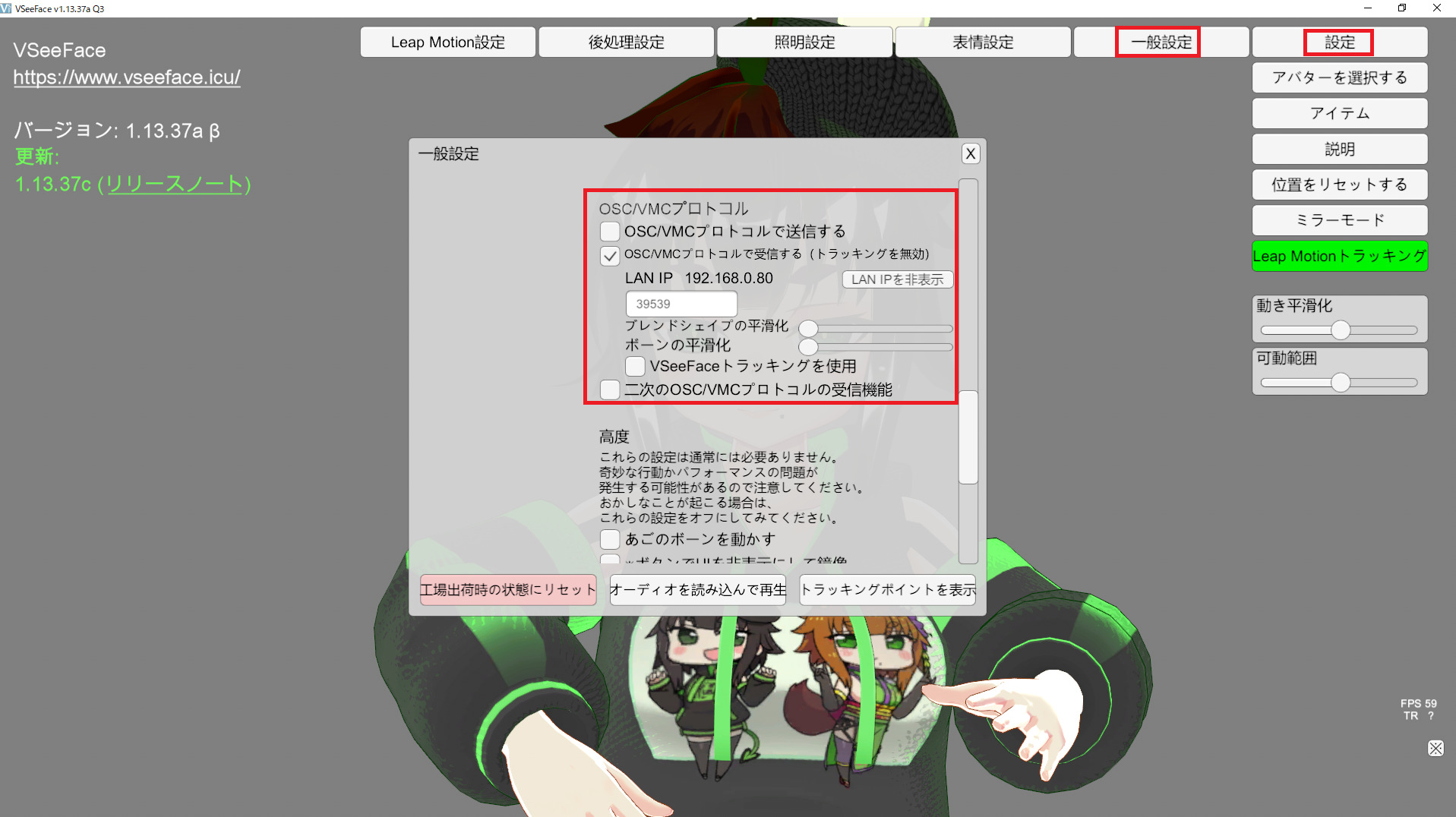 VSeeFaceのウィンドウが開いたら右上の”設定”→”一般設定”を開き、少しスクロールし”OSC/VMCプロトコル”の項目に行きましょう。