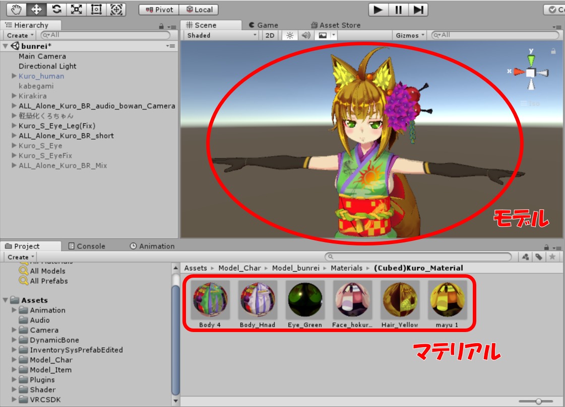 Scene内アバター、マテリアルを見ながら上記3つを設定していきます。