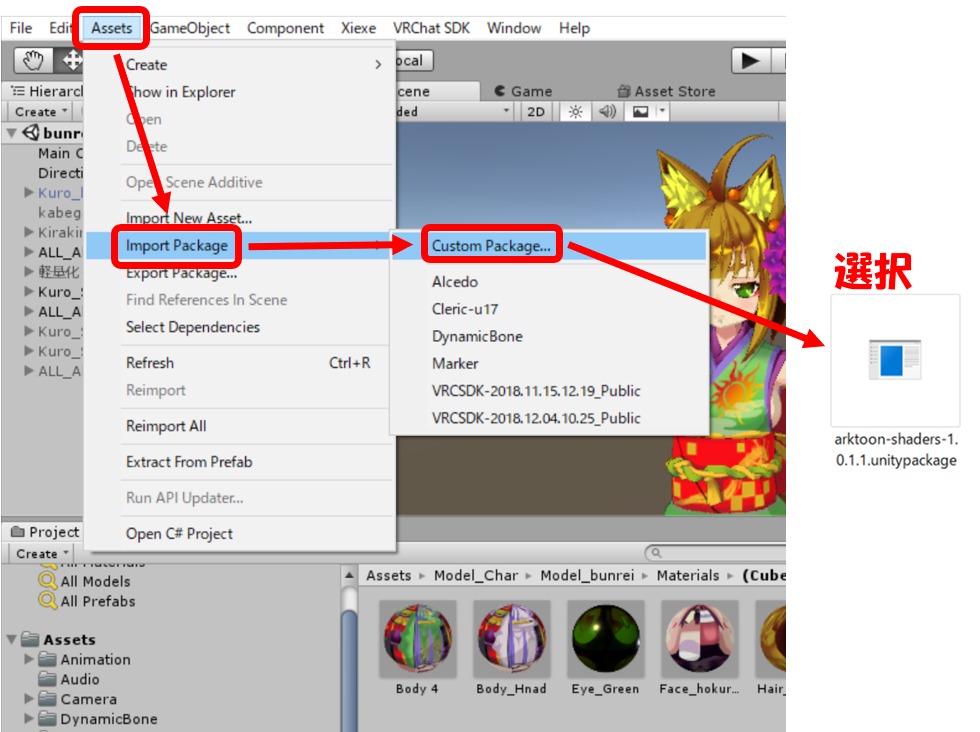 Unity上メニューバーより、「Assets」→「Import Package」→「Custom Package…」より対象のunitypackageを選択してください。