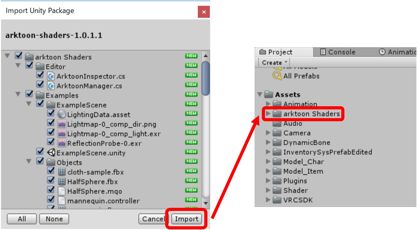 インポート後Unity内Projectに「arktoon Shaders」が追加されていれば完了です。