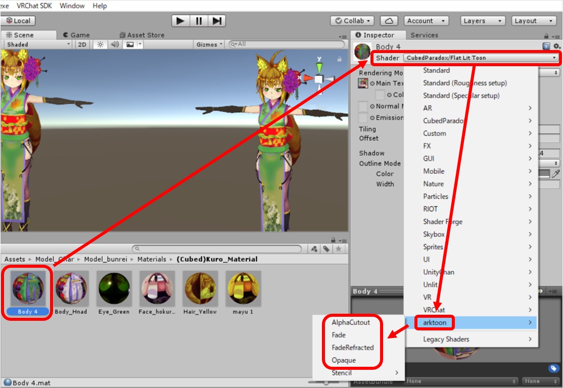 (今回私のマテリアルでは全て”arktoon – Opaque”に設定してあります。)