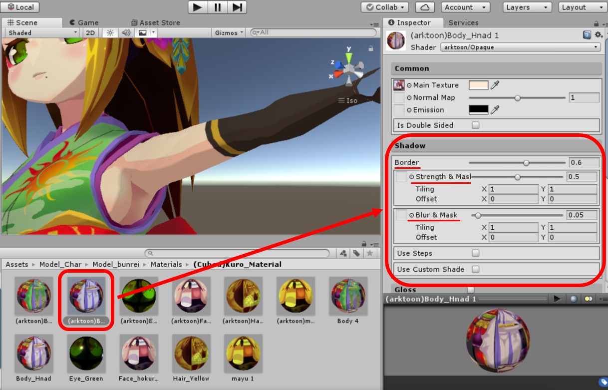 くろちゃん(分霊)の腕部分に設定されているマテリアルを選択しInspector内の”Shadow”項目で調整ができます。