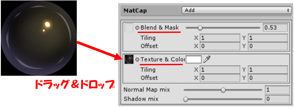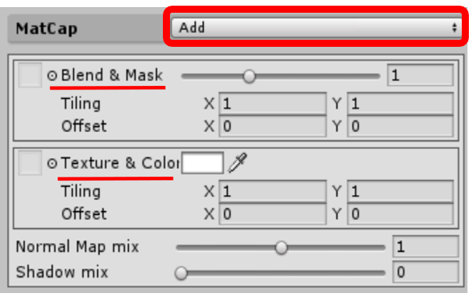 設定項目はMatCapの合成方法、”Blend&Mask”,”Texture&Color”