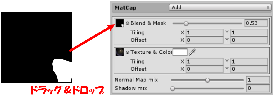 さっそくこの白黒(マスク)テクスチャをさきほどのMatCap設定に入れてみます。