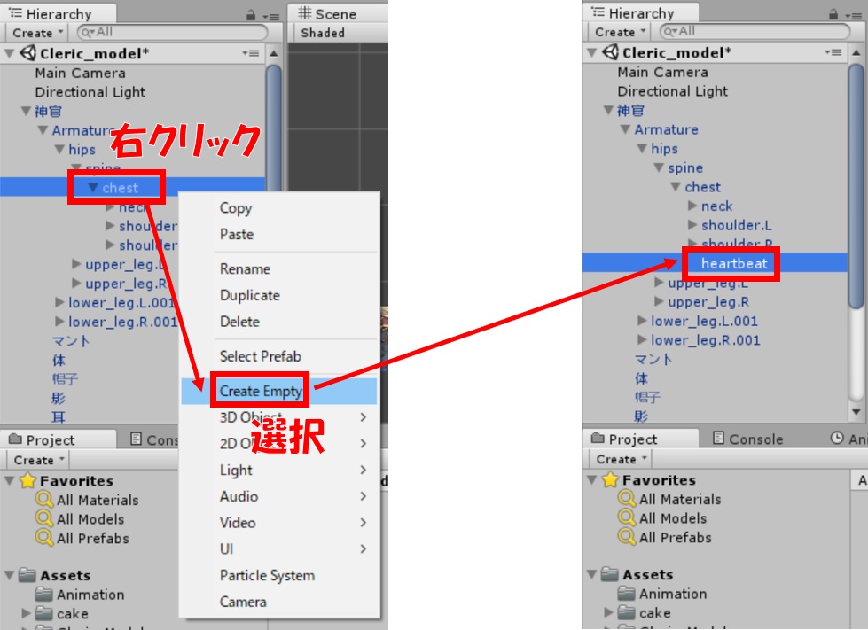 Chestで右クリック→ Create Empty → 名前変更(わかりやすいもの、今回は「heartbeat」)