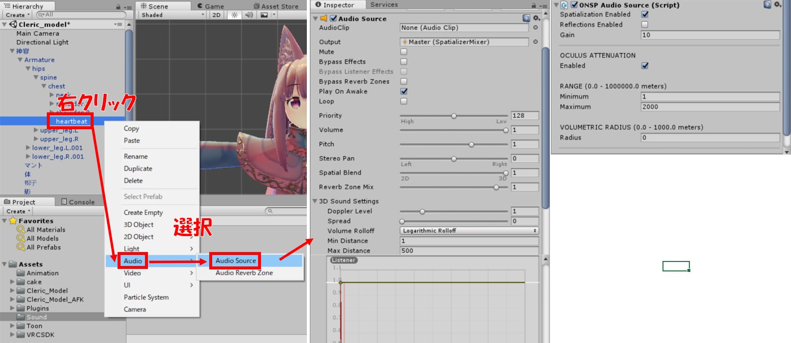 右側Inspectorに「AudioSource」「ONSPAudioSource(Script)」が追加されていればOK