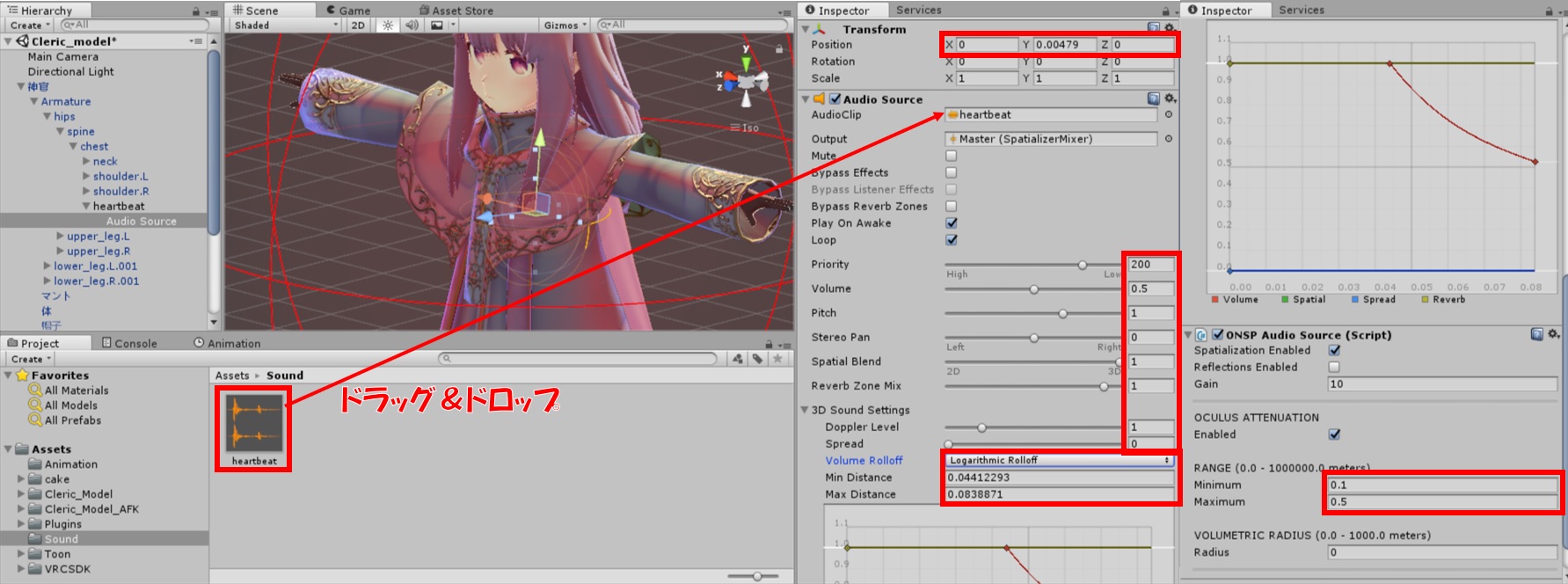 注意:音源の位置を頭付近に近づけすぎると、VRChat内で自分のヘッドホンなどから心音が聞こえてくる場合があります。そういった場合は心音位置の調整をしてください。