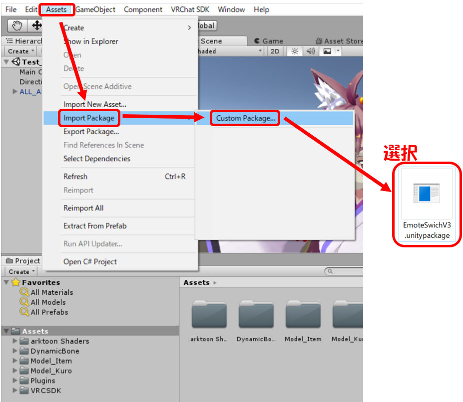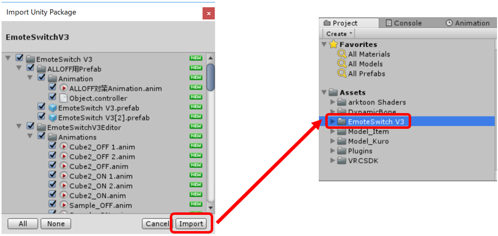 インポート後Unity内Projectに「Emote Switch V3」が追加されていれば完了です。