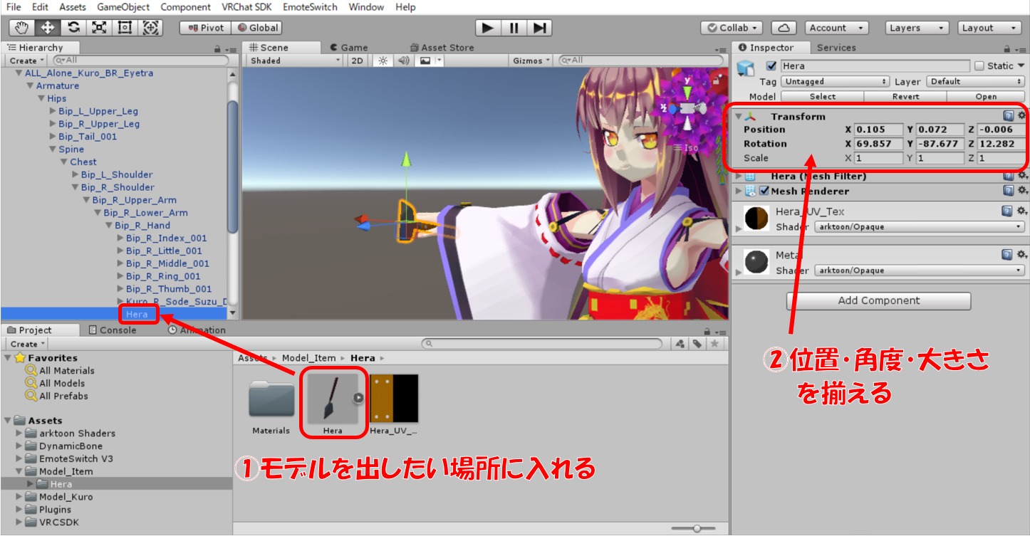 ①インポートしたモデルをアバターモデルの右手(R_Hand)にドラッグ&ドロップ