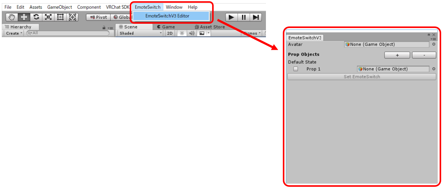 メニューバー内に追加されている「EmoteSwitch」→「EmoteSwitch V3 Editor」を押しエディタを起動しましょう。