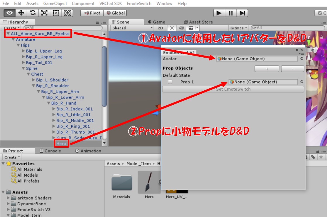 ②”Prop”にアバターモデルに設定した小物モデルをドラッグ&ドロップする