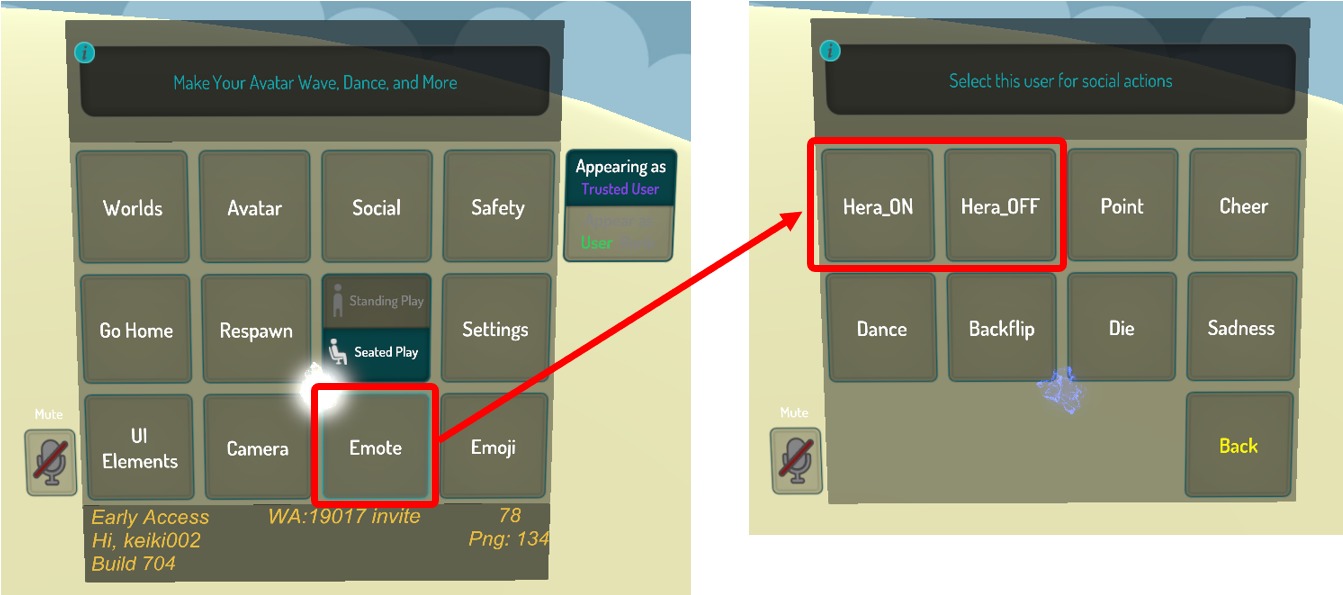 VRChatに標準であるメニュー内のエモート(アニメーションアクション)を使用して、