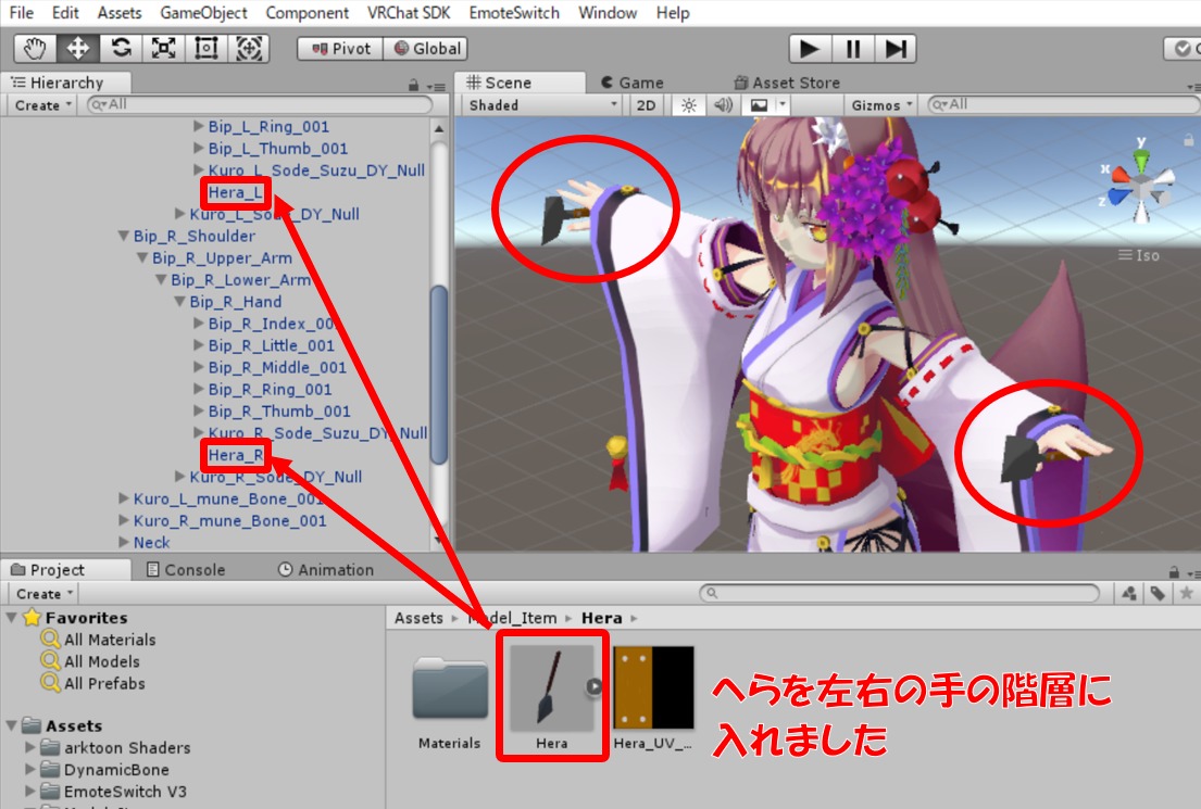 先でも書きましたが、私は”へら”を入れるためアバターモデルの右手に持たせていきます。