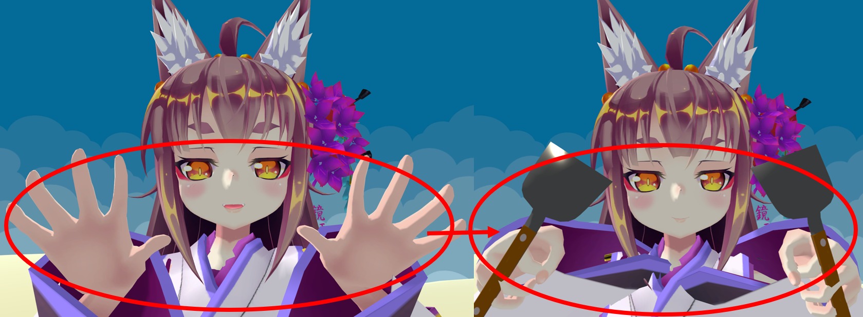 まずはアバターモデルの両手にへらを持たせ、位置などの調整をします。