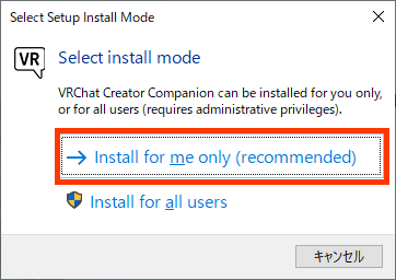 実行後、ウィンドウが出てきたら”Install for me only(recommended)”を選択