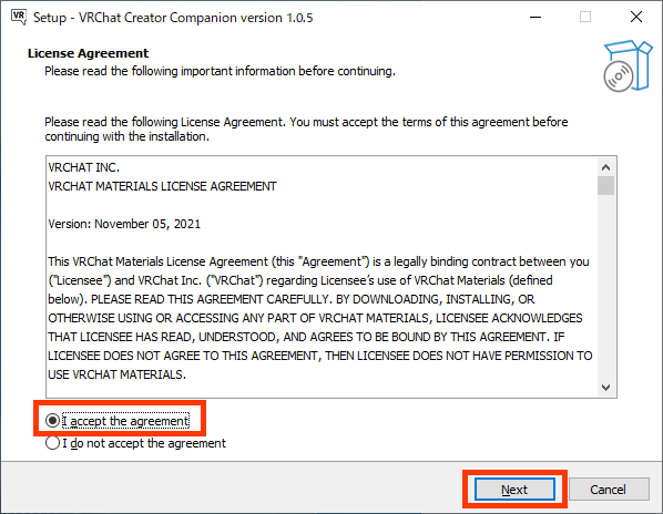 “I accept the agreement”を押し”Next”を選択