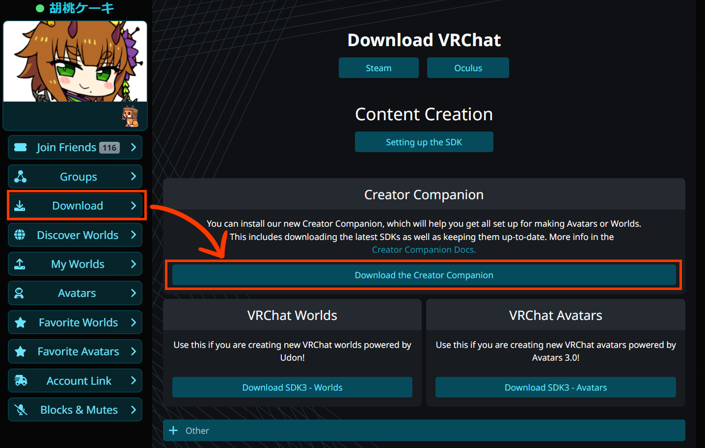 “Download”から”Download the Creator Companion”をダウンロードしましょう。