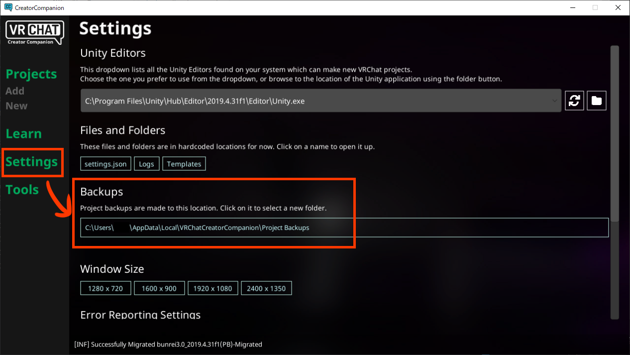 また、保存先はVCC内”Settings”から”Backups”よりフォルダを決められます。