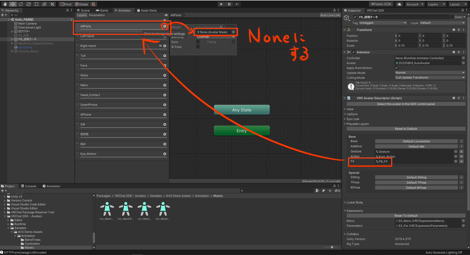 こうなってしまった場合は、FXレイヤーの最上段レイヤーからAvatarMaskを抜くことで手が動くようになります。