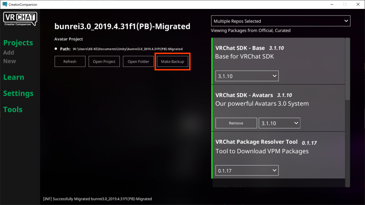 VCC内の”Project”よりバックアップしたいプロジェクトを選択し、”Make Backup”を押します。