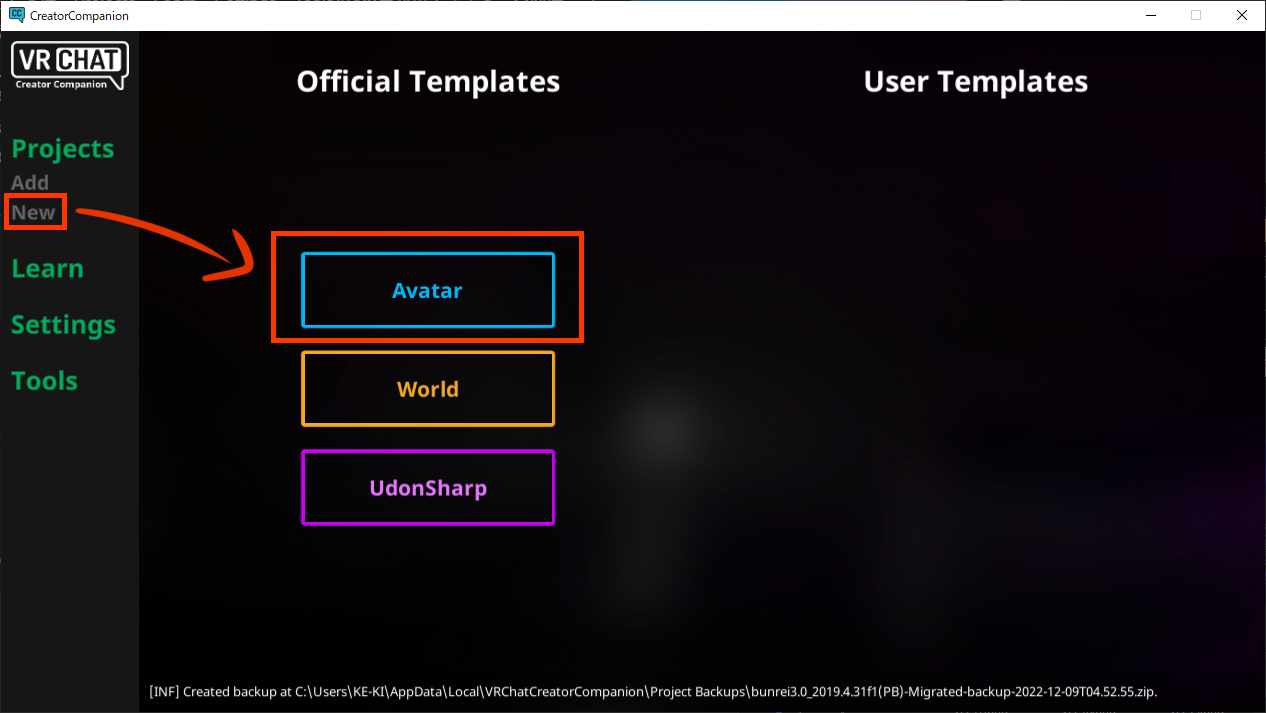 VCC内の”Project”から”New”を押し、”Avatar”を選択します。