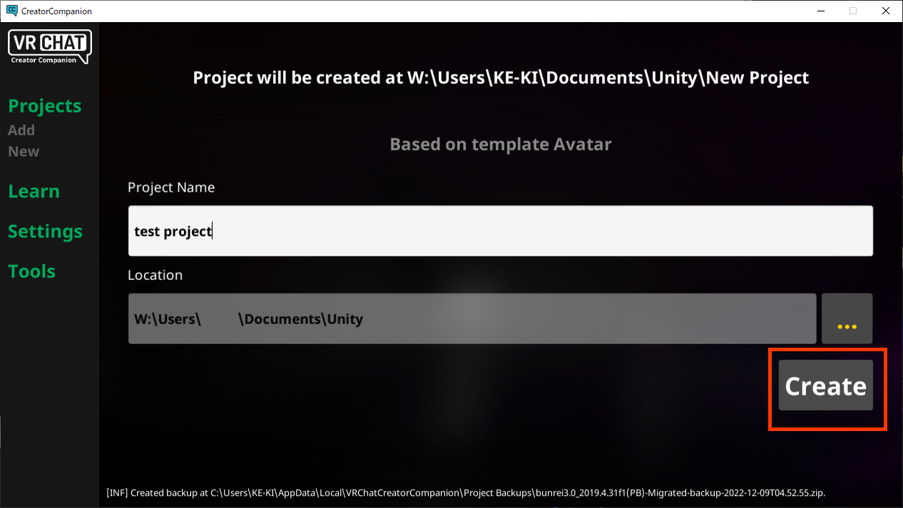次の画面でプロジェクト名と保存先を決めて”Create”でプロジェクトができます。