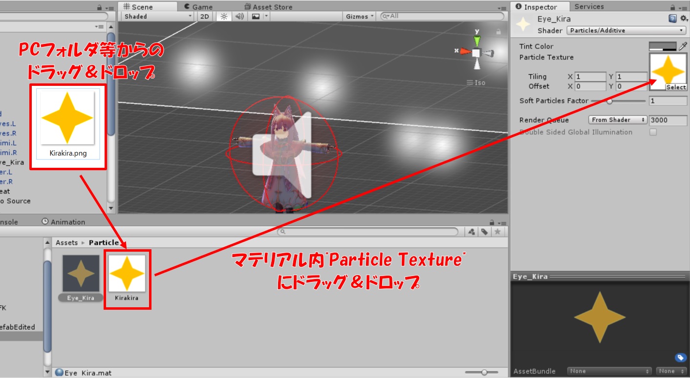 Particleフォルダ内に用意した画像も入れ、マテリアルに反映しましょう。