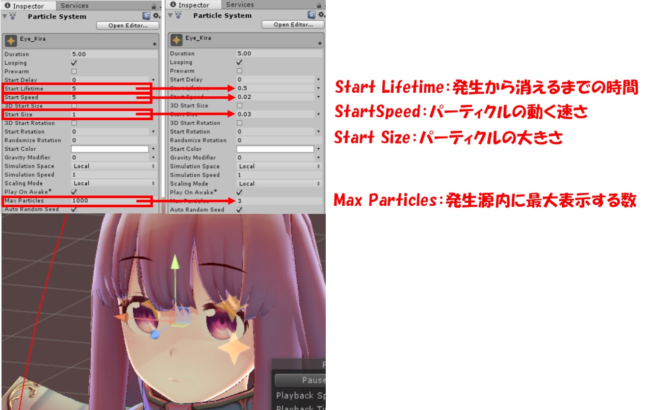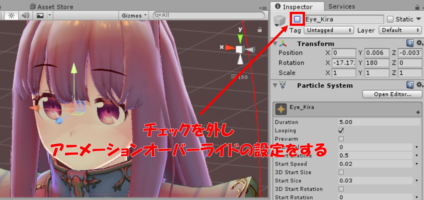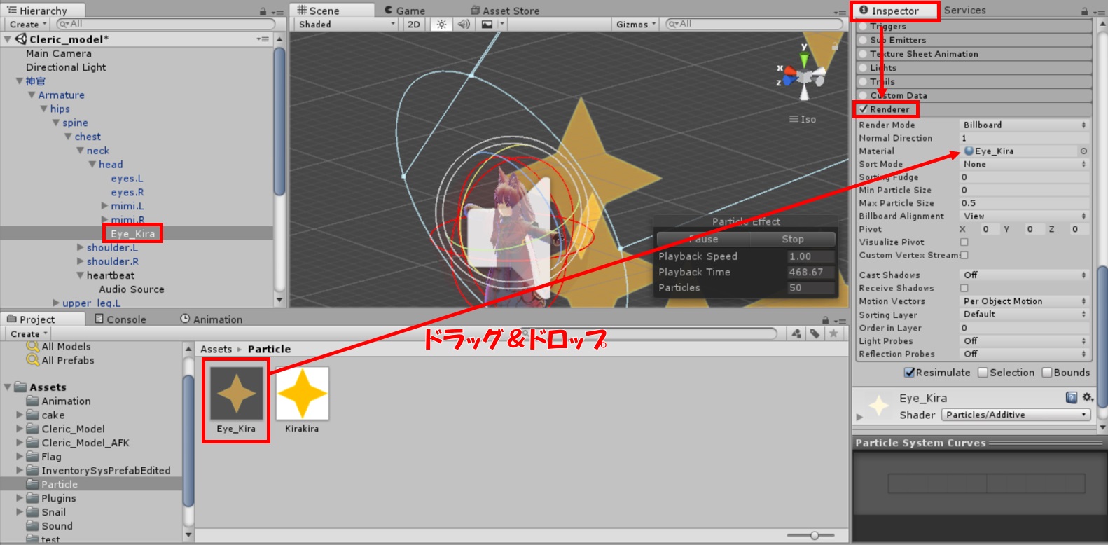 作成したParticle Systemはわかりやすいように名前を変更しておきましょう(Particle System → Eye_Kira)(任意)