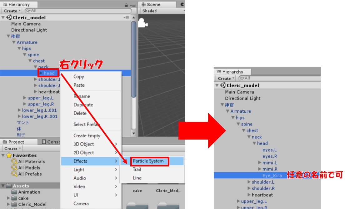 UnityのHierarchy(左上)からアバターのエフェクトを付けたい部分で右クリック→ 「Effects」 → 「Particle System」を選択しましょう。