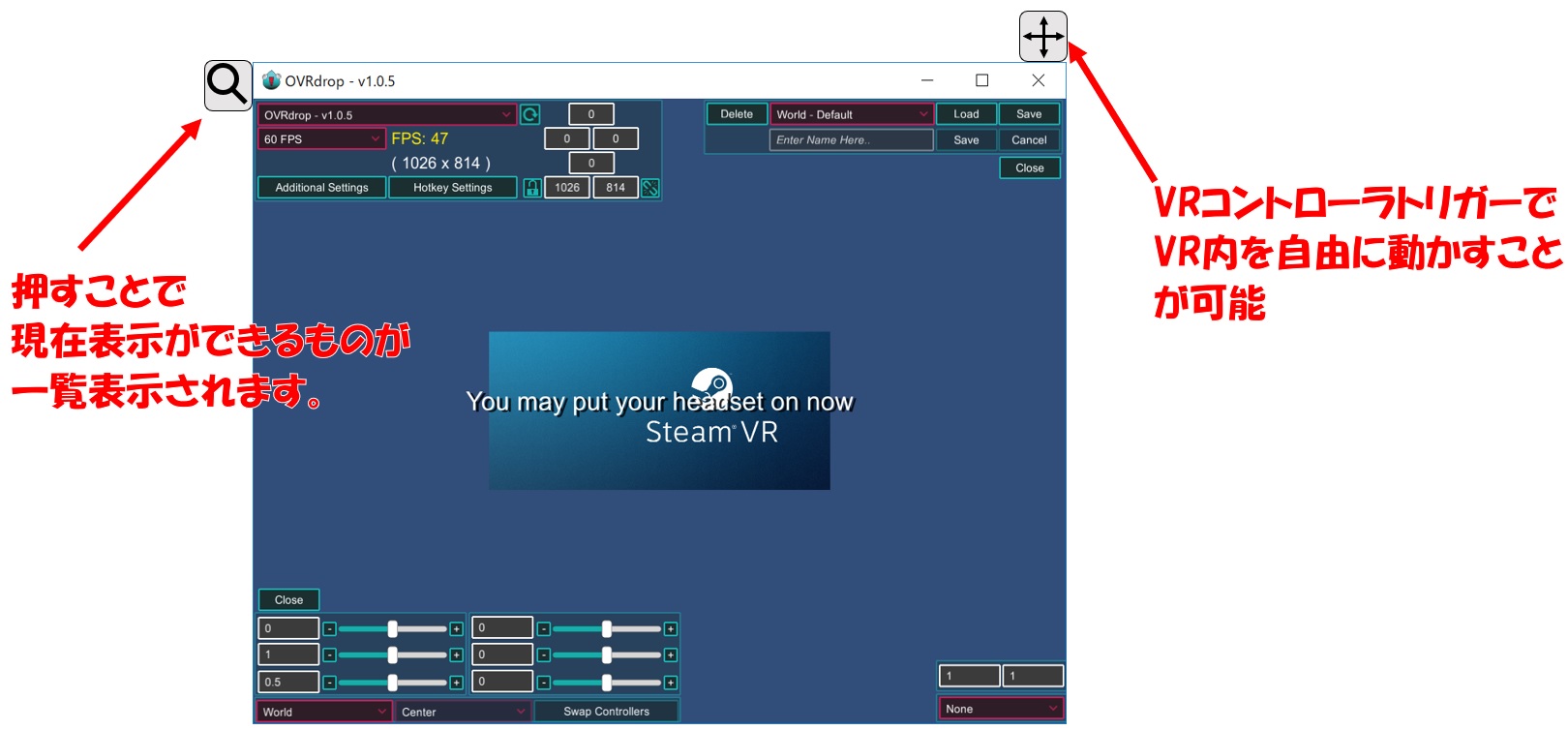 VR内OVRdropウィンドウにて、VRコントローラを近づけると右上に十字、左上に虫眼鏡が表示されます。