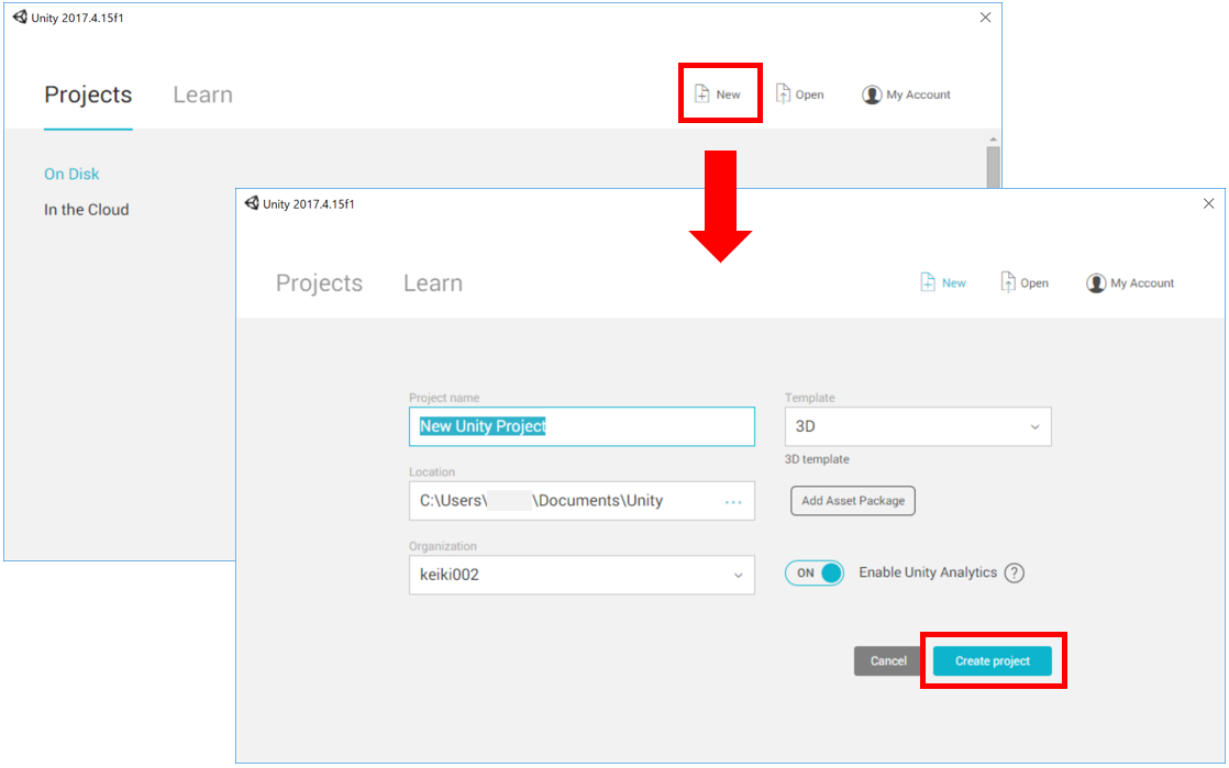 新規プロジェクト作成画面が立ち上がったら、「Project name」,「Location」を分かりやすい任意のものに変えましょう。あとprojectnameの右のは「3D」を選択してください。