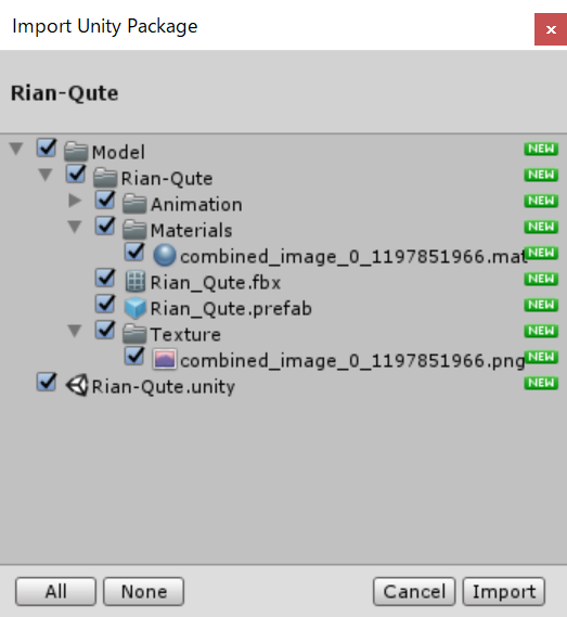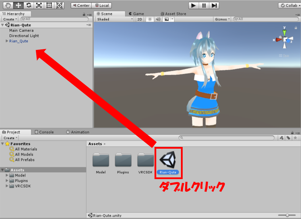 インポートが完了したらAssets内にある”Rian-Qute.unity”をダブルクリックし設定されたアバターモデルを読み込みましょう。