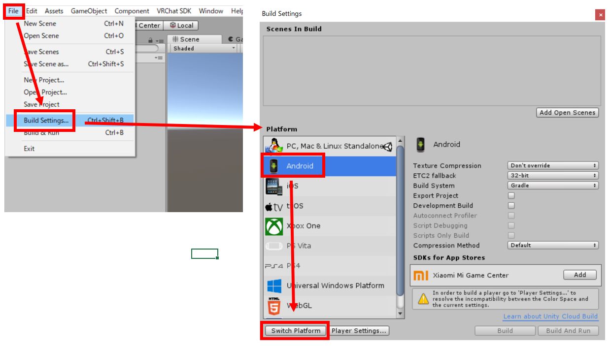 Unity画面の左上、”File”→”Build Settings…”を選択し、新しく出てきたウィンドウ内”Platform”→”Android”を選択し、