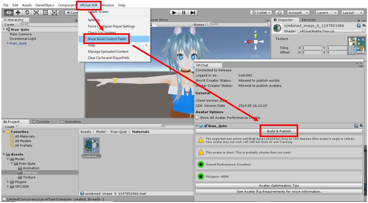 メニューバーから”VRChat SDK”→”Show Build Control Panel”を選択し、アップロードしたいアバターの”Build&Publish”を選択