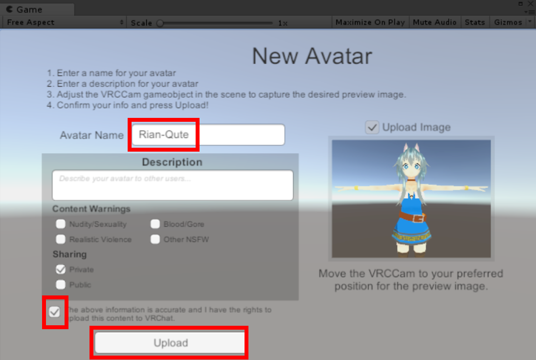 Gameタブに出てきたウィンドウにアバターネームとチェックを入れ、”Upload”で完了になります。