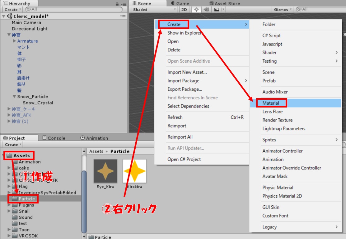 UnityのProject(左下)Assets内にて右クリック → Creat → Folder、名前を「Particle」としました。