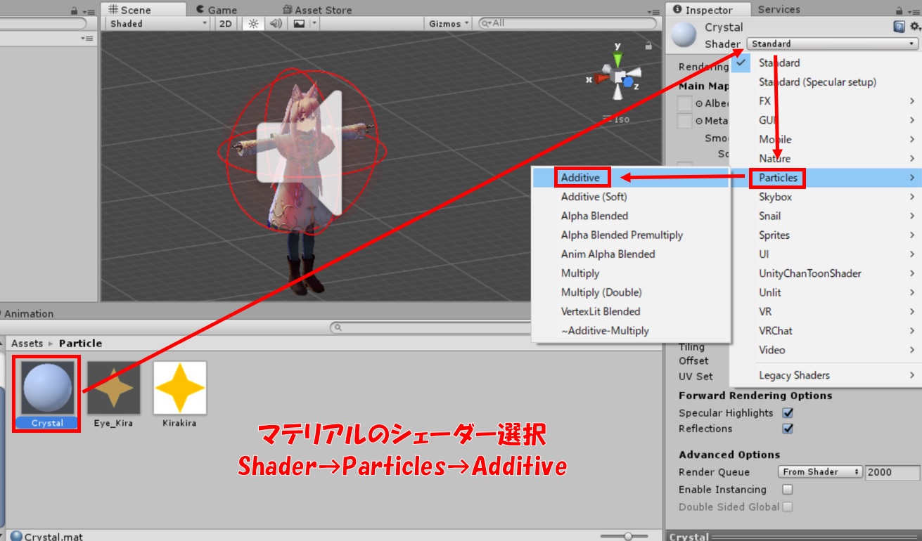 マテリアル選択後、UnityのInspecet(右側)内のShader → Particles → Additive を選択。