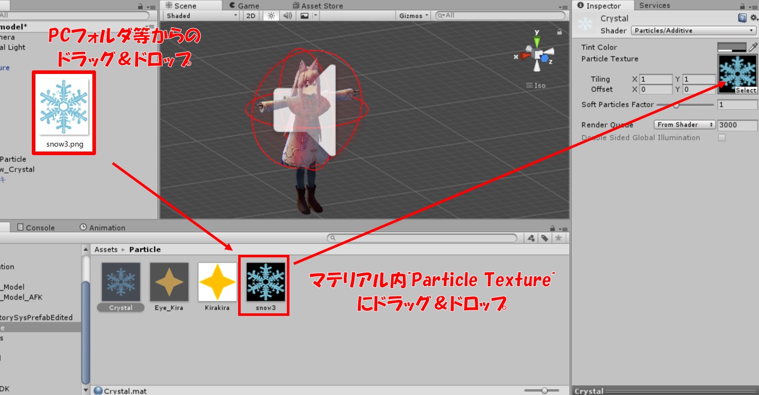 Particleフォルダ内に用意した画像も入れ、マテリアルに反映しましょう。