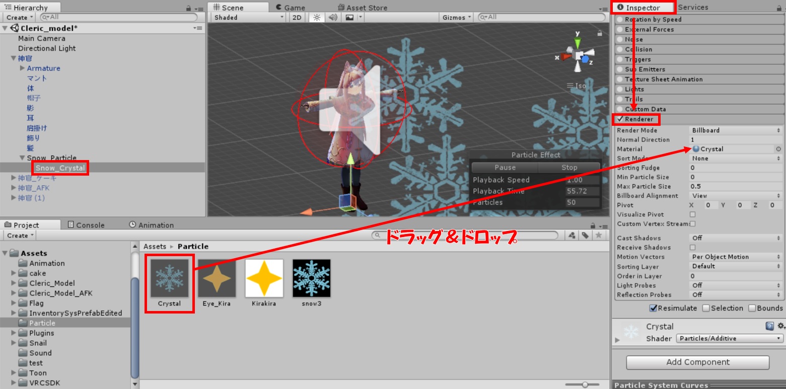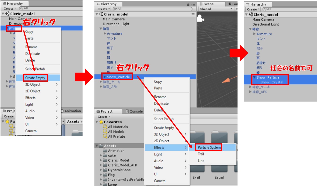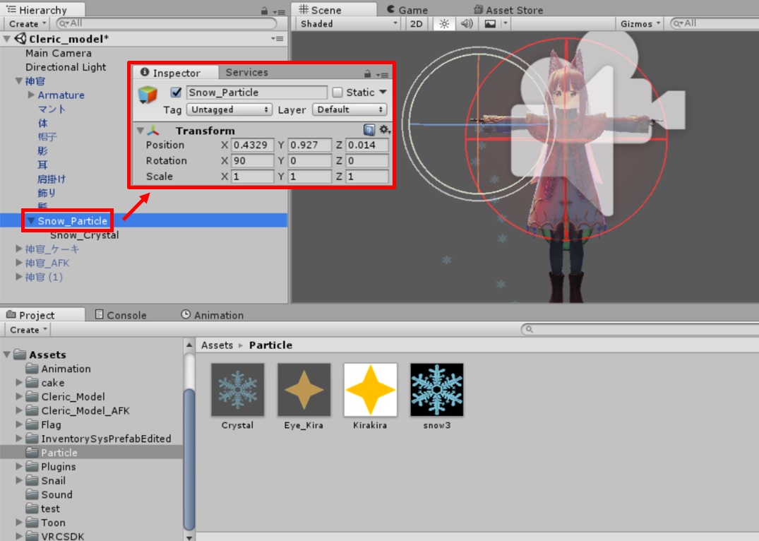 作成したGameObjectとParticle Systemはわかりやすいように名前を変更しておきましょう(GameObject → Snow_Particle, Particle System → Snow_Crystal)(任意)
