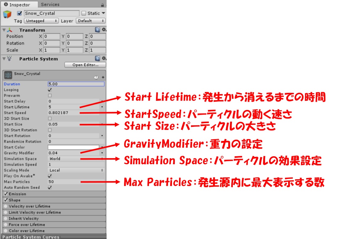 設定するのはInspector内のTransFormとParticle Systemの基本部分を設定してきます。