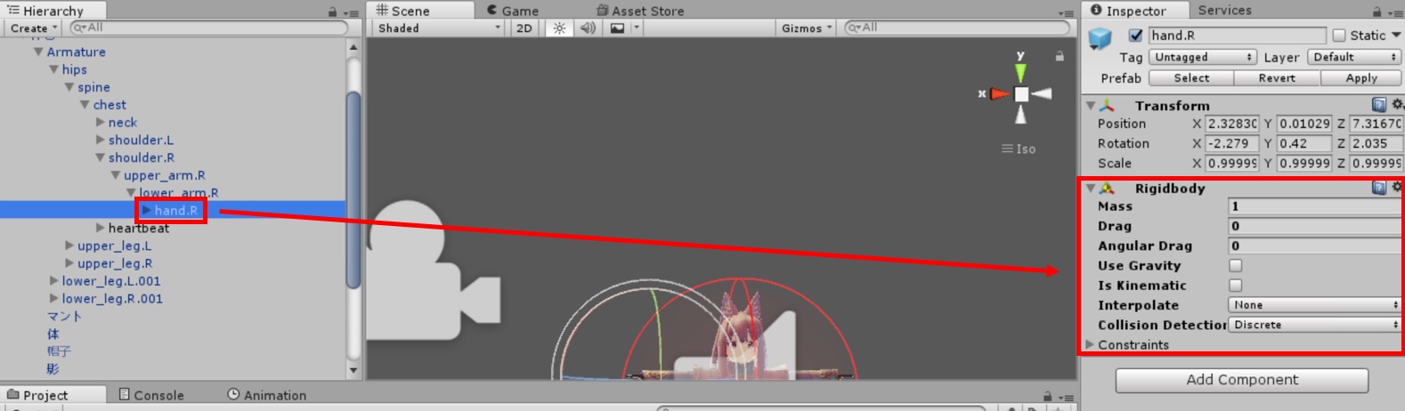 Hnad.Rまでたどり着いたらInspector内のAdd Componentにて「Rigid」などで検索し”RigidBody”を追加します。
