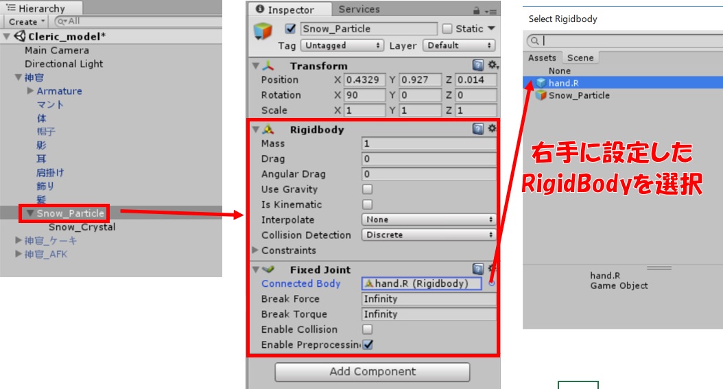 Armatureの外に出ているGamebject(Snow_Particle)を選択しInspectorからAdd Component、「Fixed」などで検索し追加します。